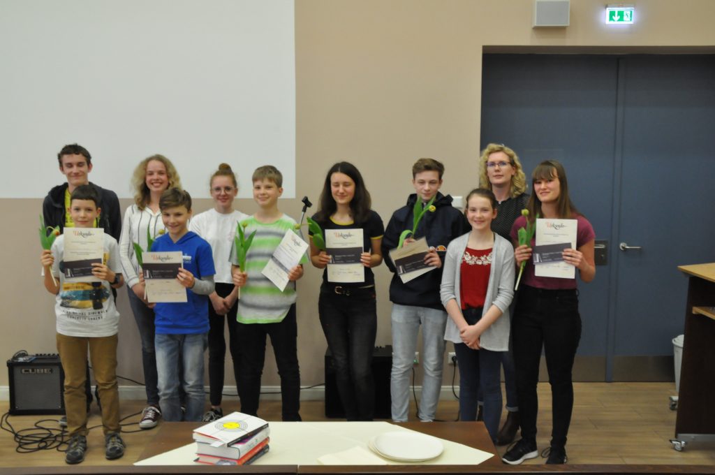 Als Verpflegung und Motivation stellten die beiden Organisatorinnen und Deutschlehrerinnen Anja Felber und Kati Thiel kleine Snacks für uns bereitet. Kurz vor der Siegerehrung erhielten wir noch Besuch von Max Skladny und Leon Lenz, zwei Freizeitmusikern unserer Schule. Mit ihrer Metalcore-Band „Terminus Grave“ spielten sie uns ein paar ihrer selbstgeschriebenen Lieder vor. Diese Überraschung rundete das Fest noch einmal richtig ab, da Kunst, Musik und Literatur doch, wie wir alle wissen, eng zusammenhängen. Am Ende des Tages fand die Siegerehrung statt. Von den Fünft- bis Siebtklässlern gewann Lukas Schwarzhut aus der 6 LM, allerdings nur mit knappem Abstand zu Jonathan Reuter aus der 5 LM, er belegte den zweiten Platz. Den dritten Platz erhielt ebenfalls die 5 LM mit Niklas Horbank. Aus der achten bis elften Klasse errang Hanna Scholz aus der 9 M stolz den ersten Platz. Der zweite Platz wurde an Jonas Opitz aus der 8 LM vergeben. Ebenfalls aus der 8 LM und dicht gefolgt, erreichte Janka Bensler den dritten Platz. Zu gewinnen gab es einen Lesegutschein für den Erwerb von neuem Lesestoff. Es ging aber nicht nur um das Gewinnen, sondern auch darum, den ganzen Tag zu Ehren der Literatur, die uns das Leben mit ihren Lesewelten verschönern kann, zu genießen. Außerdem sind alle teilnehmenden Schüler(innen), so glauben wir, Gewinner im Herzen unserer Deutschlehrer(innen).