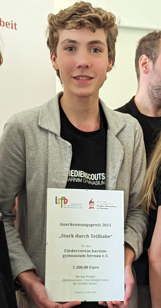 Das Projekt Medienscout barnim-gymnasium-bernau wurde mit dem Anerkennungspreis 2023 ausgezeichnet. Der Preis steht unter dem Motto „Stark durch Teilhabe“ und würdigt Projekte, die Kinder und Jugendliche aktiv in Entscheidungs- und Gestaltungsprozesse einbeziehen. Die Jury, bestehend aus Mitgliedern der Waisenhaus-Stiftung, des lsfb sowie Vertreter:innen des Landesschülerrates Brandenburg, würdigte die engagierte Mitarbeit der jungen Medienscouts.
